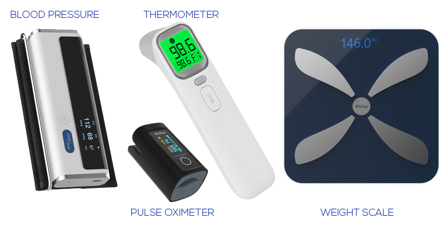 Currently we use four devices: blood pressure, pulse oximeter, thermometer, and weight scale. We are continuing to look at other devices going forward so that you can provide more care and information.